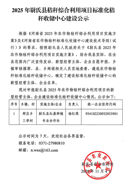 2025年尉氏县秸秆综合利用项目标准化秸秆收储中心建设公示