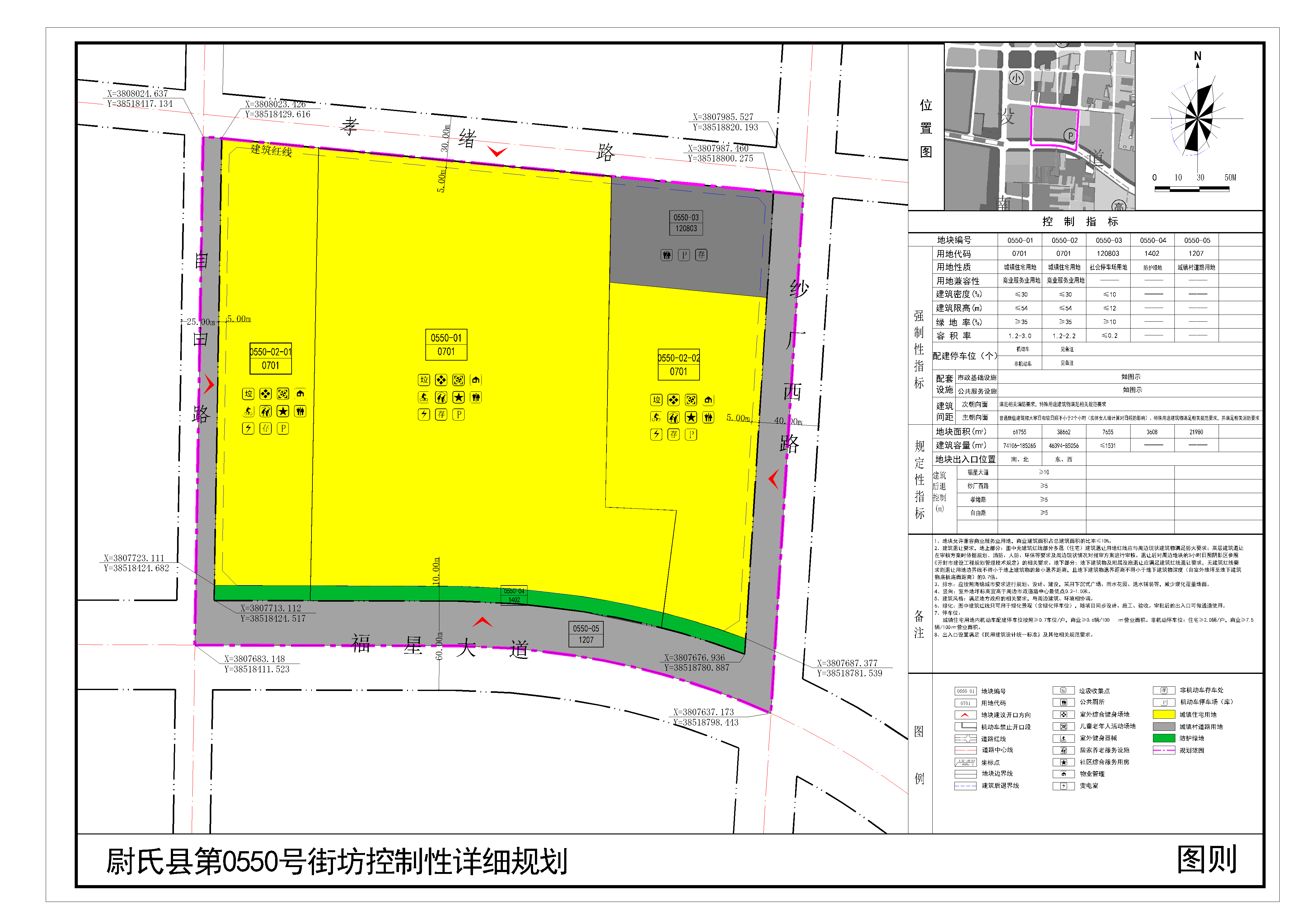 尉氏县第0550号街坊位于尉氏县福星大道与纱厂西路交叉口西北,规划范围内用地性质为城镇住宅用地、社会停车场用地、防护绿地、城镇村道路用地。详见附图“尉氏县第0550号街坊控制性详细规划(图则)”。