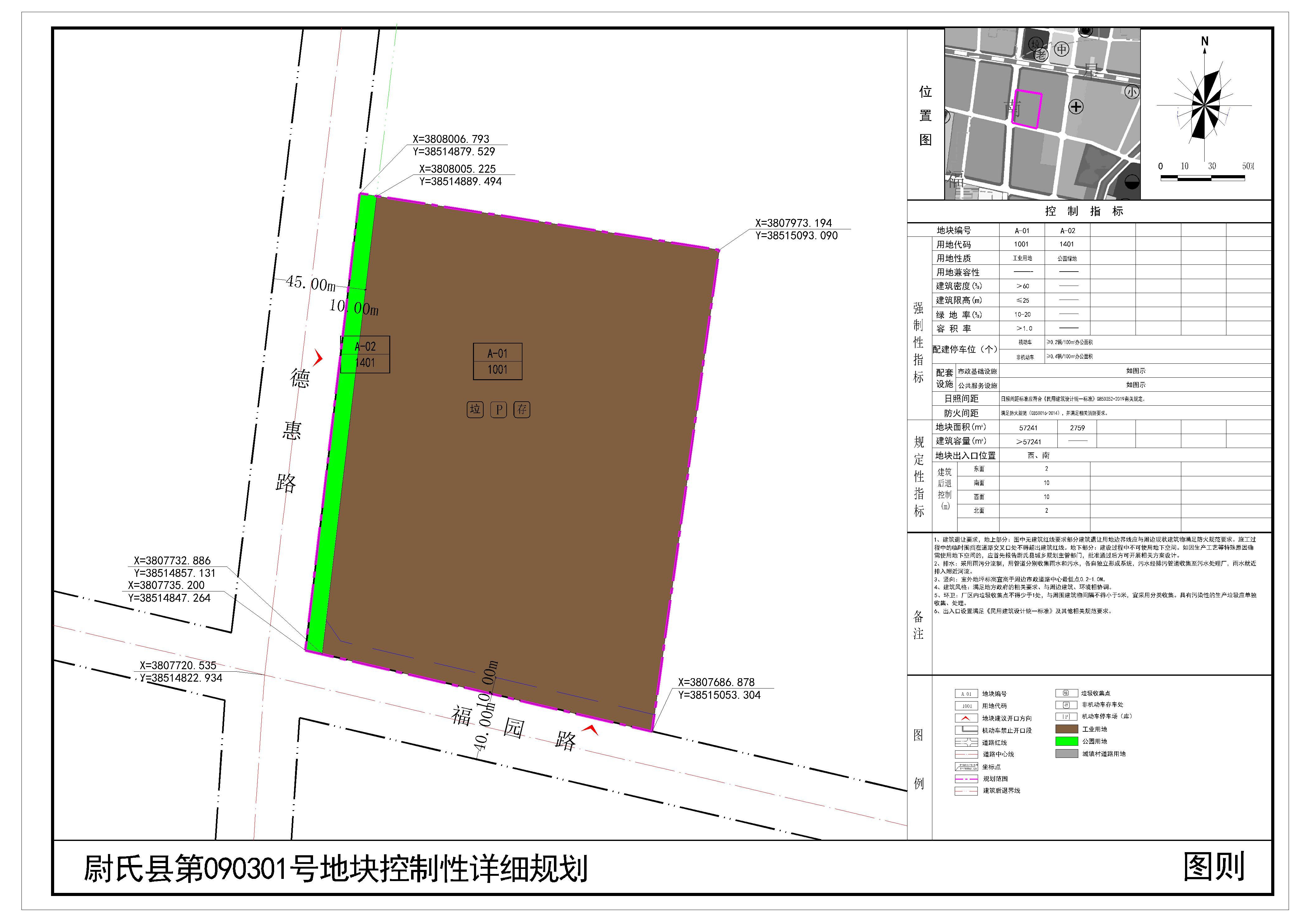 尉氏县第090301号地块位于尉氏县福园路与德惠路交叉口东北,规划范围内用地性质为工业用地、公园绿地。详见附图“尉氏县第090301号地块控制性详细规划(图则)”。