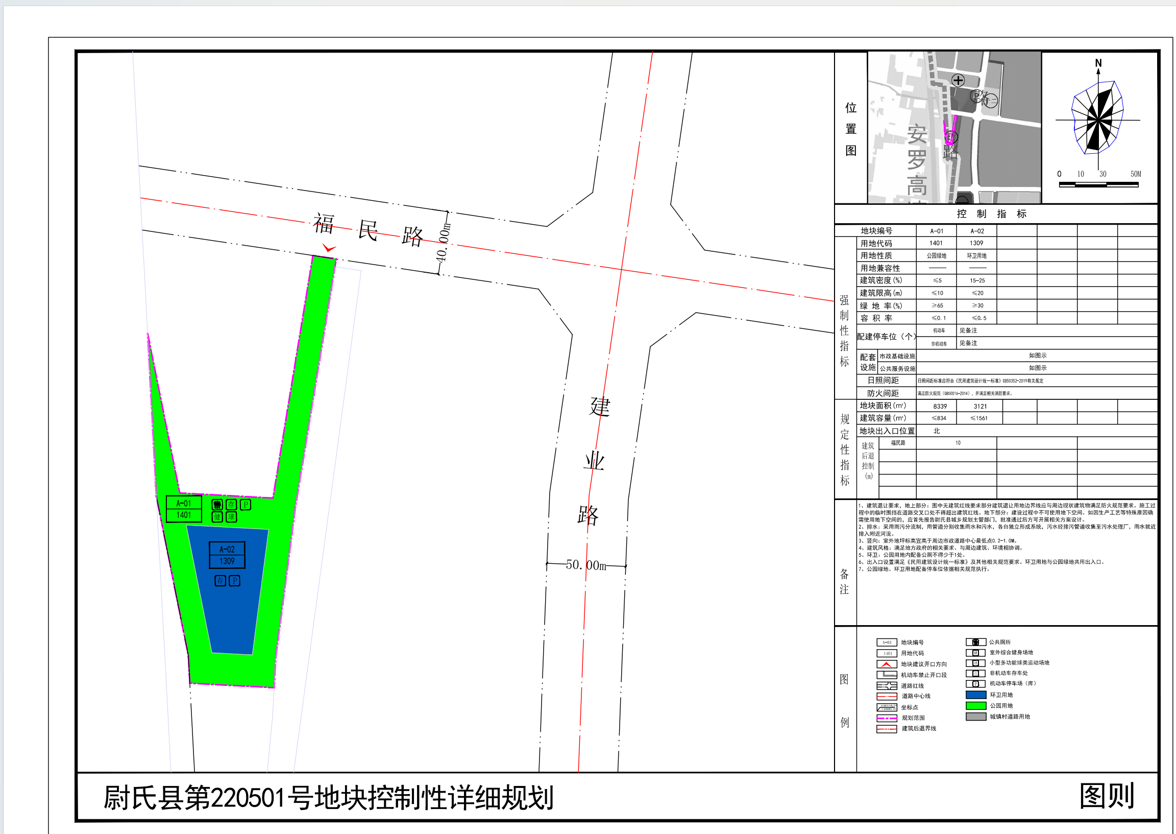 尉氏县第220501号地块位于尉氏县福民路与建业路交叉口西南,规划范围内用地性质为公园绿地、环卫用地。详见附图“尉氏县第220501号地块控制性详细规划(图则)”。