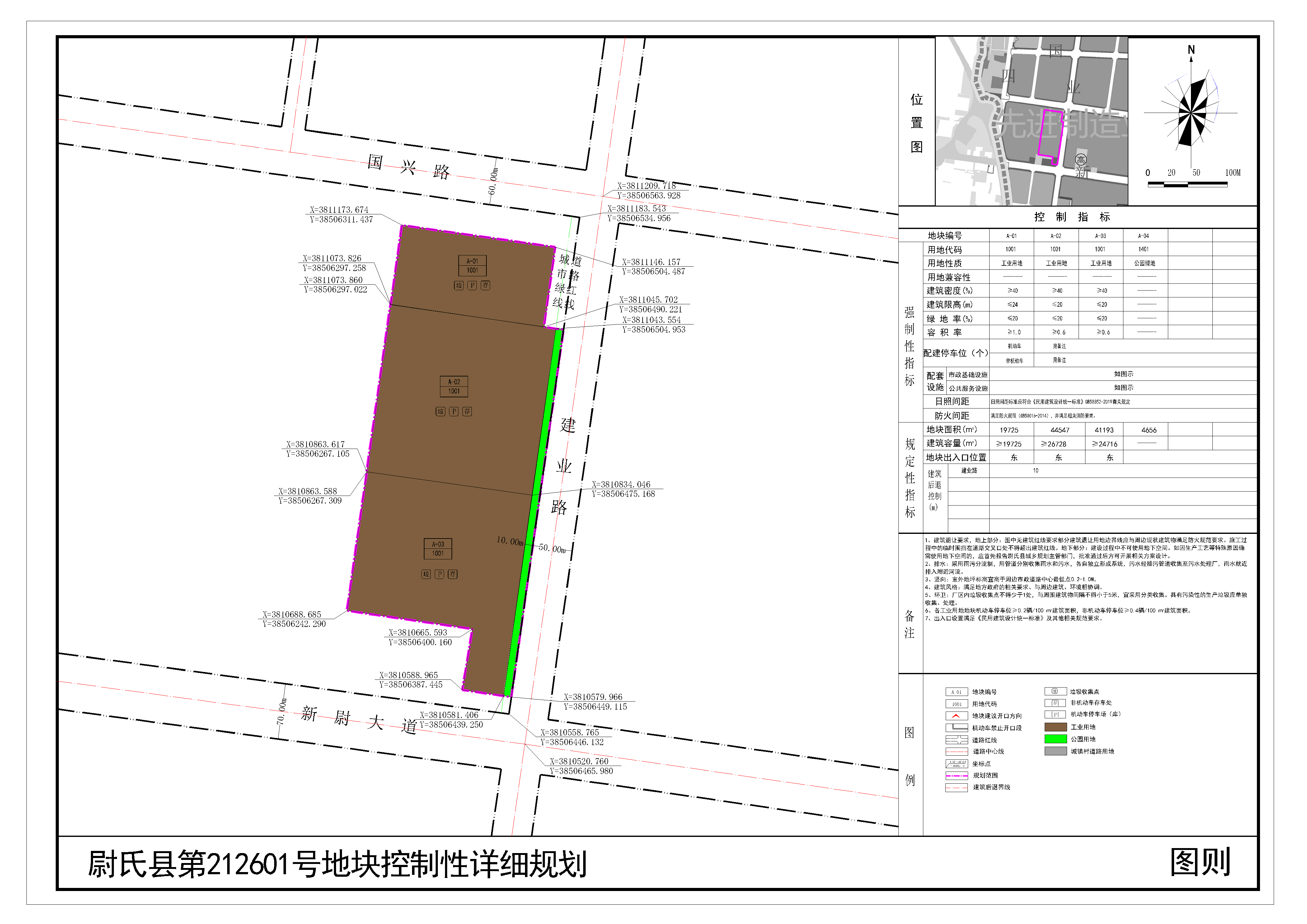 尉氏县第212601号地块位于尉氏县先进制造业开发区新尉大道与建业路交叉口西北,规划范围内用地性质为工业用地、公园绿地。详见附图“尉氏县第212601号地块控制性详细规划(图则)”。