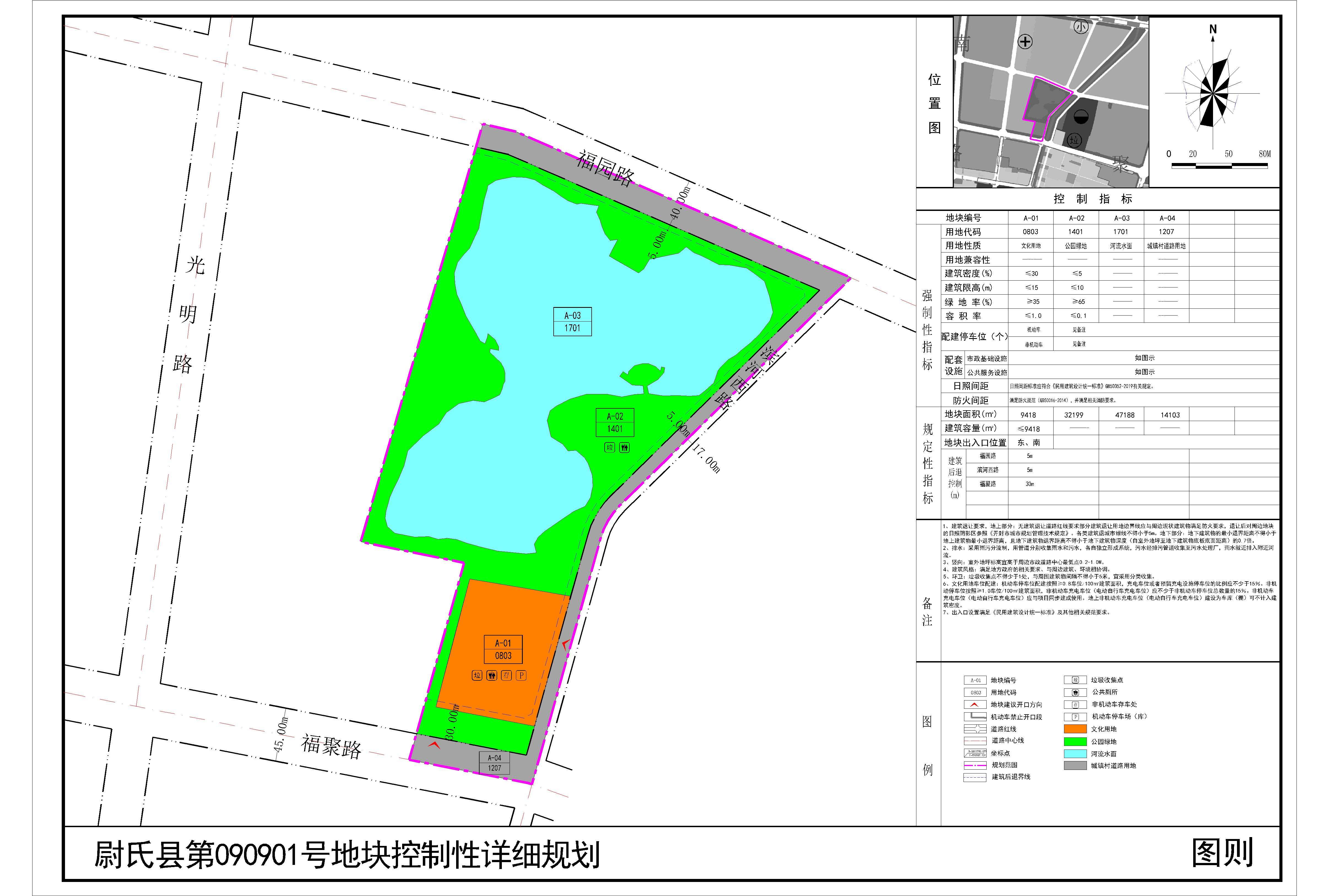 尉氏县第090901号地块位于福园路与滨河西路交叉口西南,规划范围内用地性质为文化用地、公园绿地。详见附图“尉氏县第090901号地块控制性详细规划(图则)”。