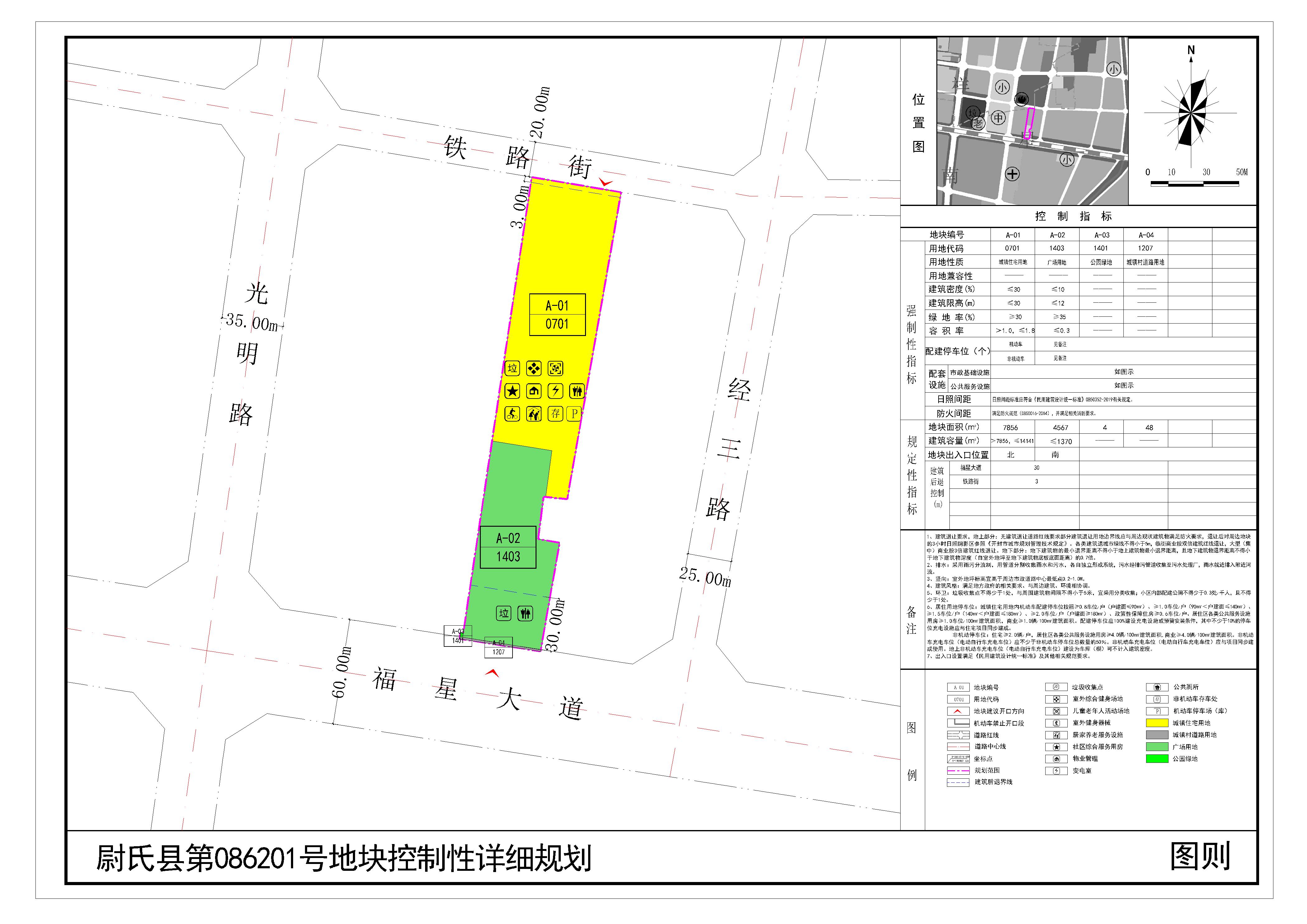 尉氏县第086201号地块位于尉氏县福星大道与经三路交叉口西北,规划范围内用地性质为城镇住宅用地、广场用地、公园绿地、城镇村道路用地。详见附图“尉氏县第086201号地块控制性详细规划(图则)”。