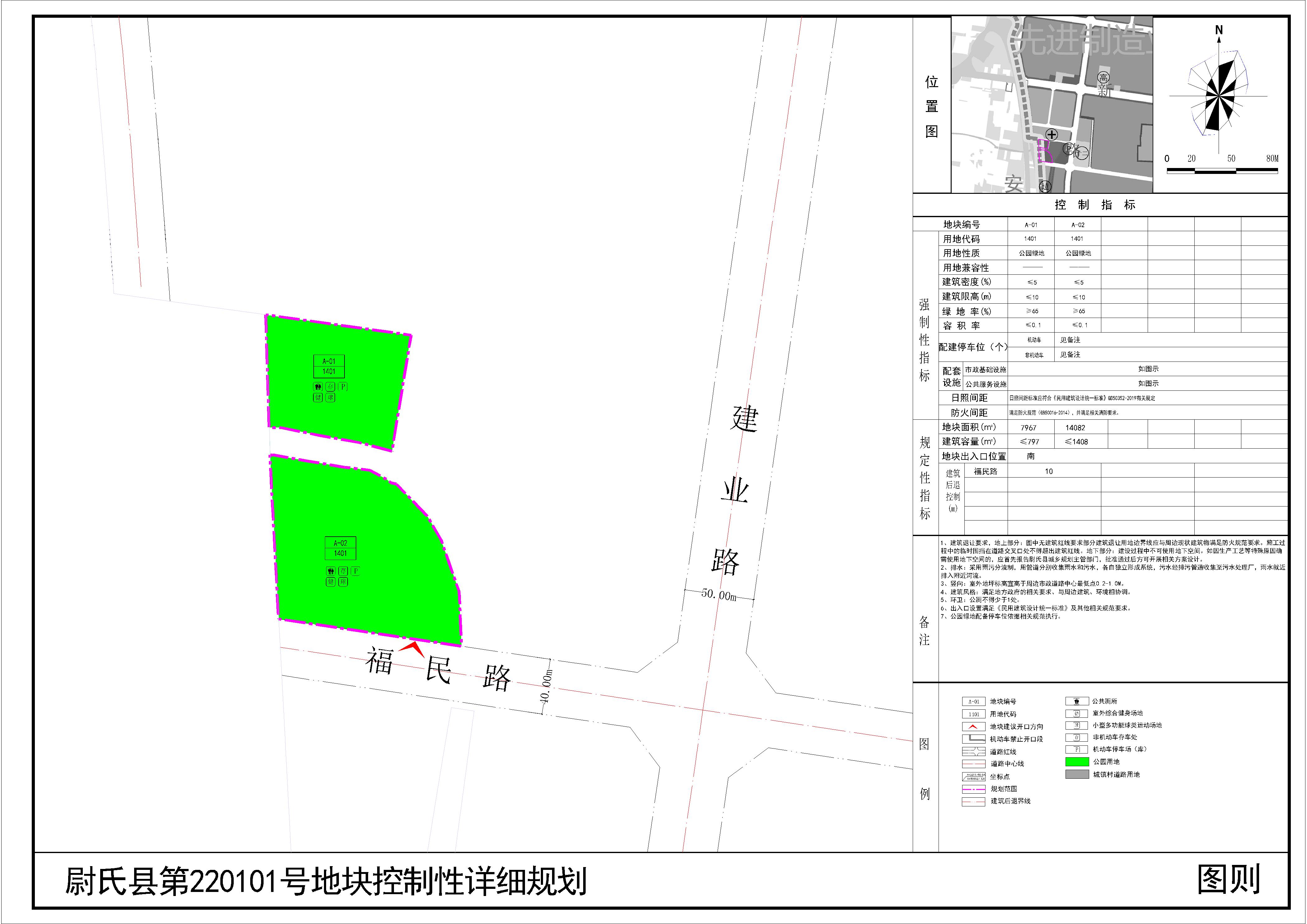 尉氏县第220101号地块位于尉氏县福民路与建业路交叉口西北,规划范围内用地性质为公园绿地。详见附图“尉氏县第220101号地块控制性详细规划(图则)”。