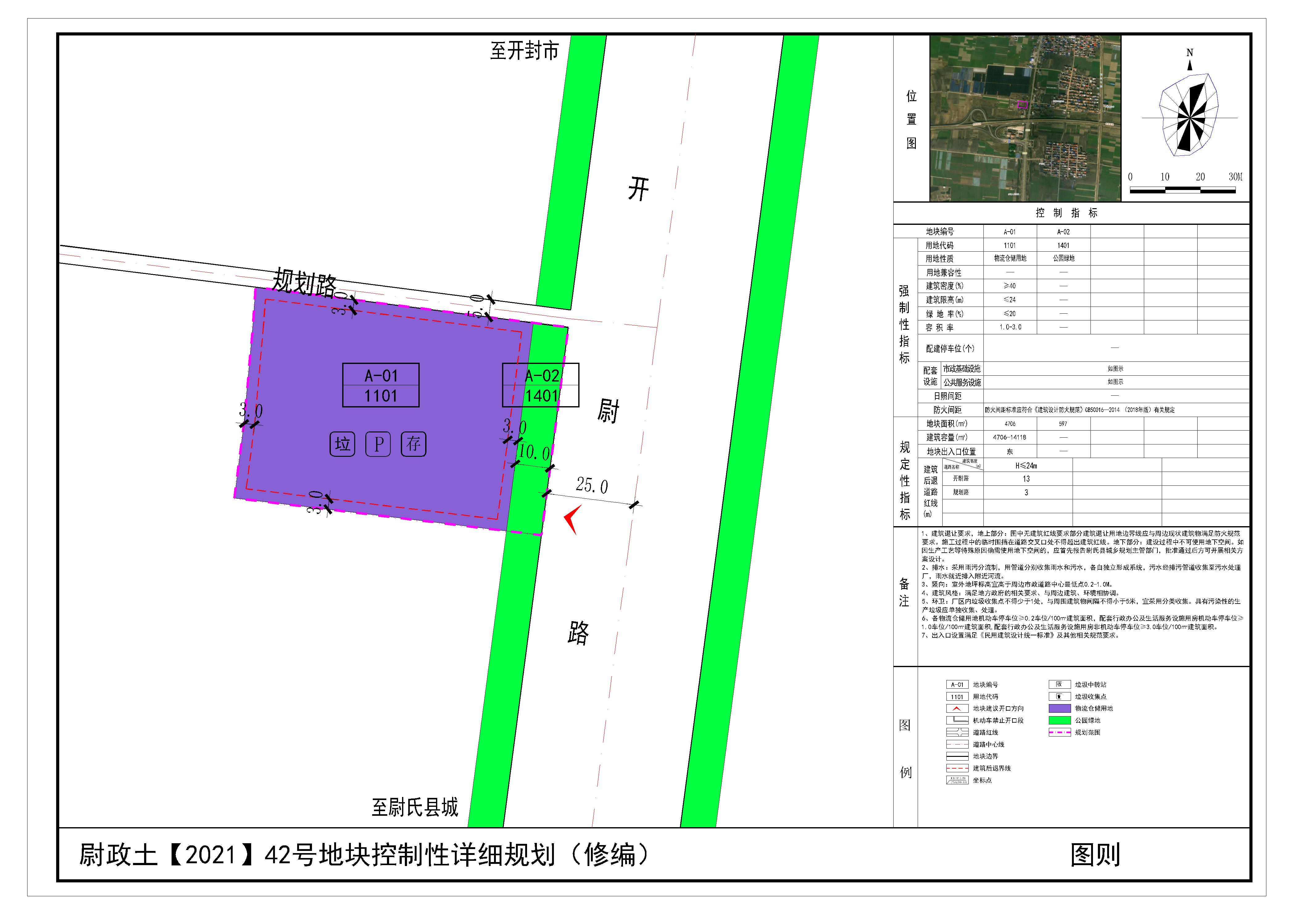 尉政土【2021】42号地块位于开尉路与商登高速交叉口西北,规划范围内用地性质为物流仓储用地、公园绿地。详见附图“尉政土【2021】42号地块控制性详细规划(修编)(图则)”。